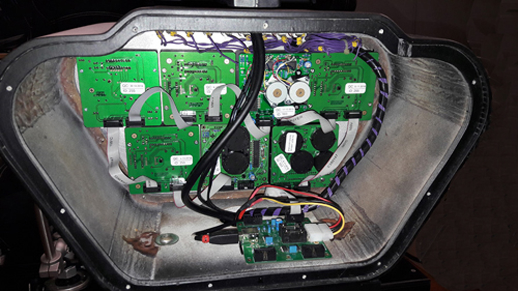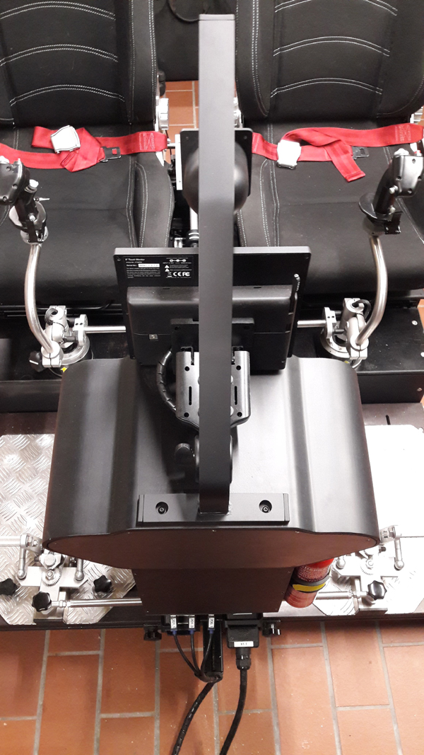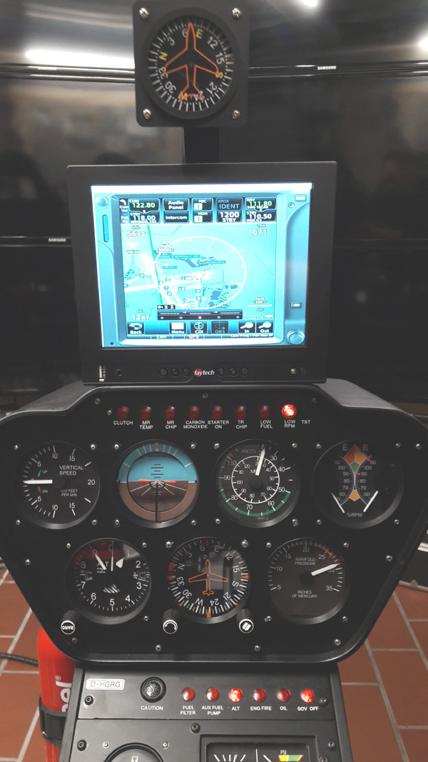 Im Cockpit sind die wichtigen Fluginstrumente und Melder. Die analogen Instrumente werden über den Flightillusion Controller vom Slave1 angesteuert, mit eigenem Bussystem. Über dem Cockpit ist der 8" Touchscreen, der das Garmin GTN750 nachbildet. Darüber ist ein Kompass in Ausrichtung zur Nase. Hergestellt aus 3mm HDF- und 3mm Alu- Platten.