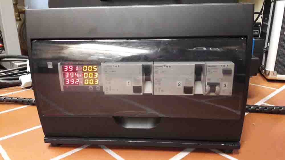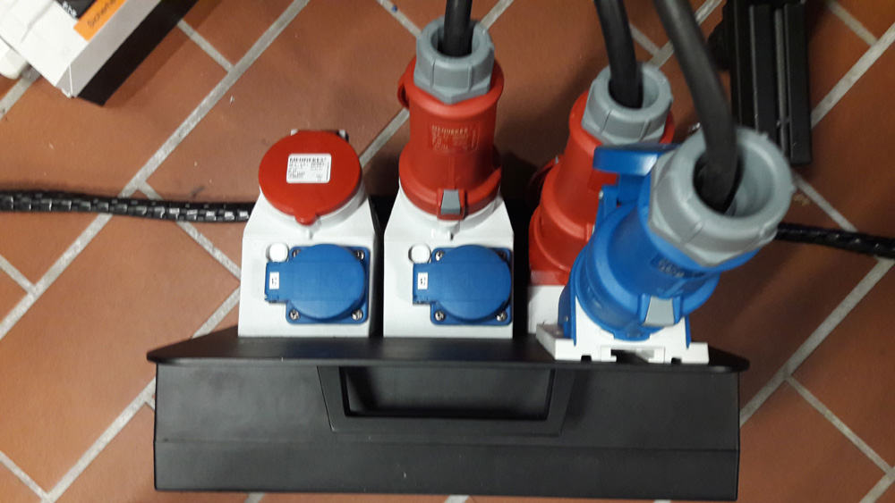 Im Einspeisefeld wurde zur Kontrolle eine Spannung/Strom Anzeige eingebaut. Die 12 Monitore werden über einen 400V 3Ph Verteiler eingespeist. Die Netzteilbox liefert alle benötigten Kleinspannungen 36V für die Endstufen, 24V für die Usb Hubs, 12V für Touchscreen, 5V für Usb/Controller. Alle Ausgänge haben zur Kontrolle eine Spannung/Strom Anzeige.